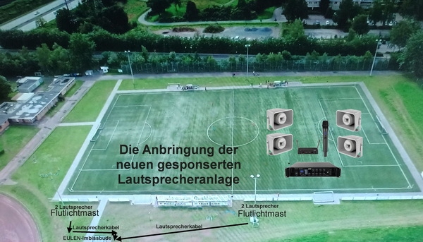 Jetzt müssen die 4 Lautsprecher – jeweils 2 Lautsprecher mittels den mitgelieferten Befestigungsmaterial an die 2 vorhandenen Flutlichtmasten installiert werden. Die Versorgung der Lautsprecher erfolgt vom Receiver. Dieser befindet sich im Eulen-Imbissstand. Über die beiden Lautsprecherkabel (die in einem Kabelschacht mittels einer gemieteten Kabelfräse / Miete ist möglich - Mitkosten / u. a. HKL in Pinneberg oder Baumaschinenvermietung in Nahe pro Tag 120,00 € verlegt werden sollten, erfolgt die Verbindung. Die Kabelfräse schafft 1,0 bis 2,0 m pro Minute. Macht bei 50 m = ca. 1 Stunde |